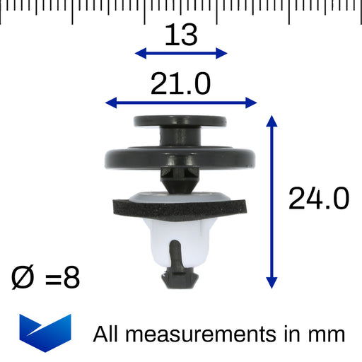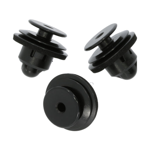 View full detailsThese black plastic nuts push onto a 5mm diameter stud in the wheel arch. They are used on the front and rear arches of several Hyundai models.