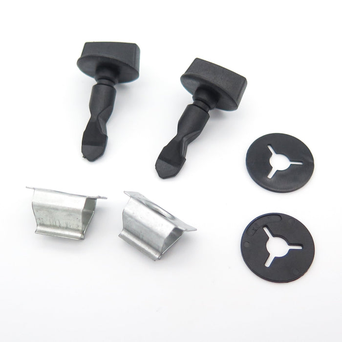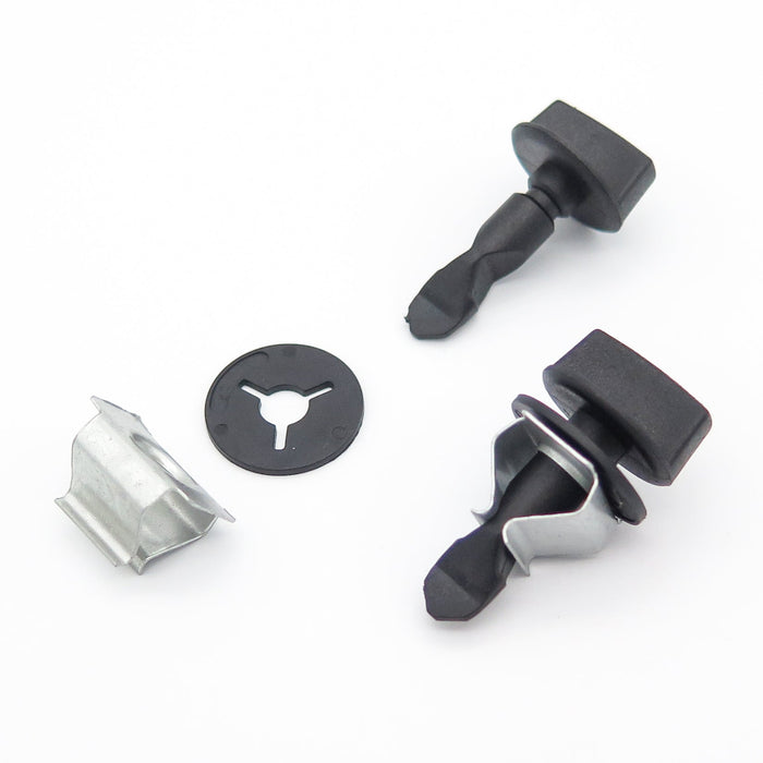 This small set of fixings is used on some Audi vehicle to attach the rear tow eye or tow hitch cover panel. The set includes two twist lock plastic bolts, two plastic washers and the metal receivers that sit in the bumper. The kit contains all of the parts you need to attach the cover.