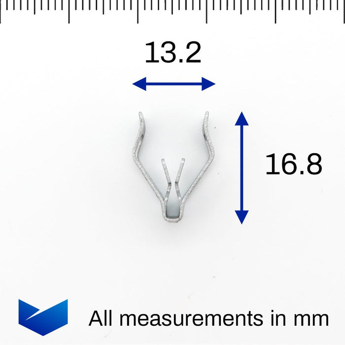 Metal spring clips that attach to lugs on interior trim panels. These are used for securing parts on the dashboard and centre console of several Mini models.