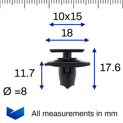 These 10mm push fit rivets are used on many different Nissan cars. Typical use is on bumpers, mudguards, side skirts or wheel arch linings.
