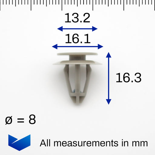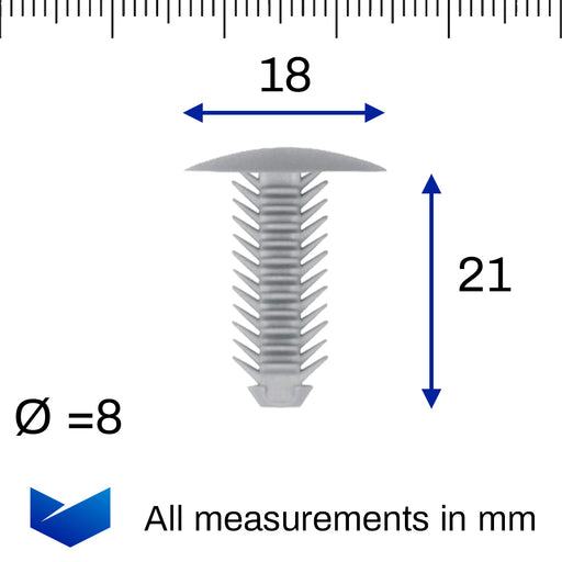 Vollständige Details anzeigenHellgraue Tannenbaum-Verkleidungsklammern, 8 mm Loch – 18 mm Kopf, perfekt für Volkswagen Wohnmobilverkleidungen