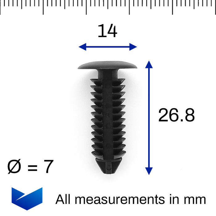 Dieser lange Tannenbaumclip passt in ein 7-mm-Loch. Der Clip wird bei vielen verschiedenen BMW-Modellen verwendet, um die Sitzlehnen am Rahmen zu befestigen. Bei einigen Modellen wird es auch für Säulenverkleidungen und Kofferraumauskleidungen verwendet. Es ist auch eine gute universelle Tannenbaumklammer.