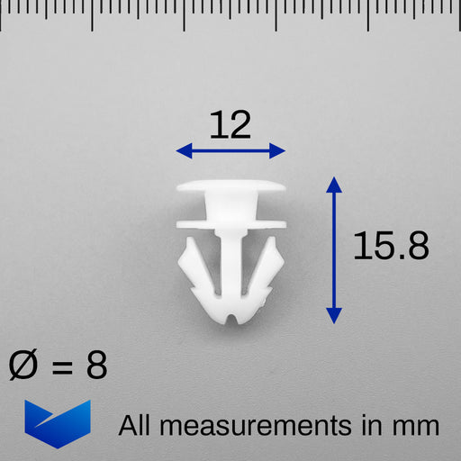 This white plastic trim fastener is used on some Mitsubishi models to secure parts including door cards, tailgate linings and pillar trims. The cli...