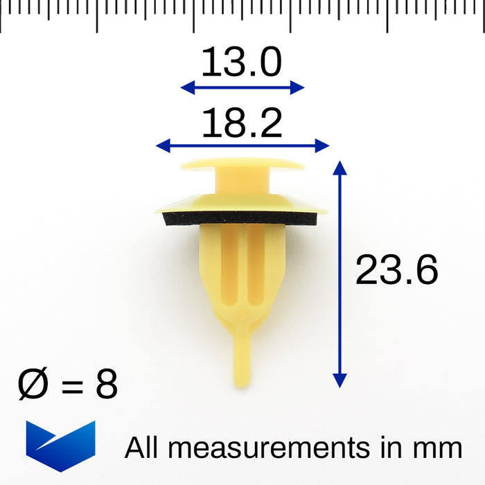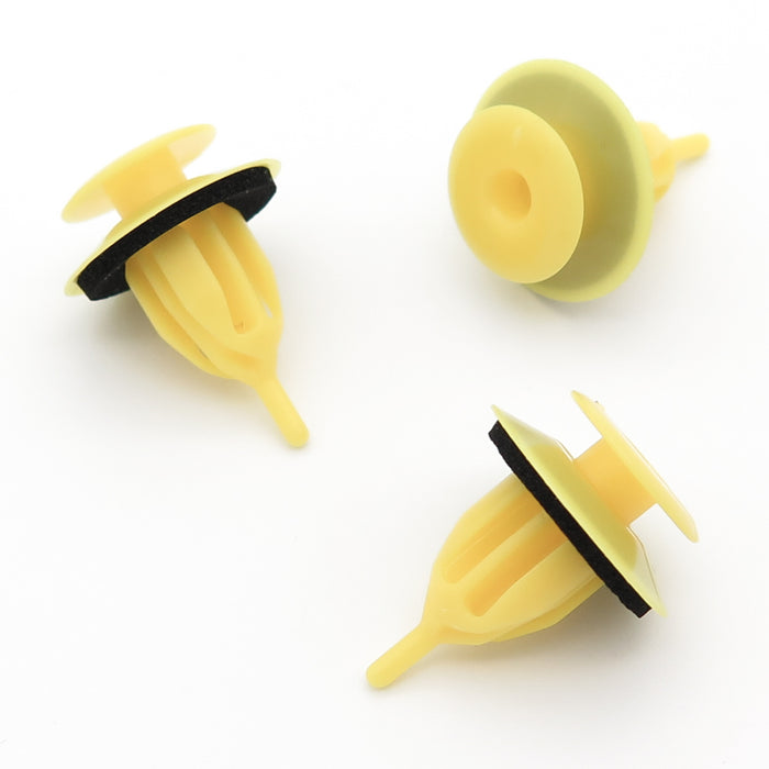These yellow plastic trim clips are used on exterior body mouldings and trim panels such as sill covers or tailgate trims. Each clip includes a foam sealing washer.