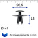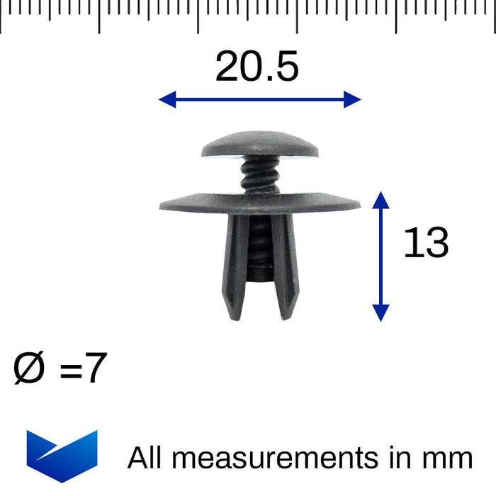 Diese Spreiznieten aus Kunststoff werden bei mehreren Mini-Modellen verwendet. Die breiten Kragenklammern werden normalerweise zum Halten flexibler Platten wie Motorhaubenisolierung oder Radlaufverkleidungen verwendet. Sie werden auch am Lufteinlass der Motorhaubenhutze verwendet.