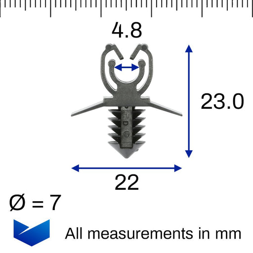 Eine standardmäßige Steckniete aus Kunststoff, die in ein 7,5-mm-Loch passt. Durch den breiten 22-mm-Kragen ist das Teil für viele verschiedene Anw...
