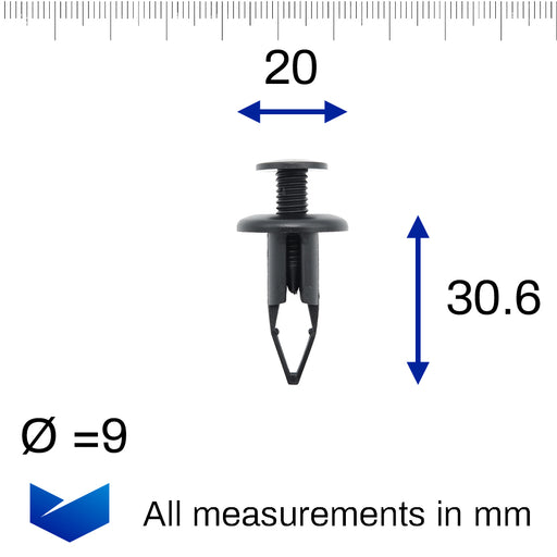 This is an equivalent to the Jaguar part C2S9354020. The screw rivet fits into a 6.5mm hole. When the centre pin is pushed in, the clip expands to ...