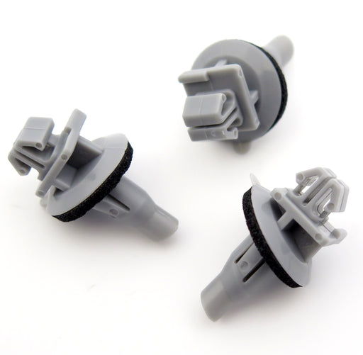 Grey plastic body moulding clips which are used to attach exterior trim. The clips slide onto the back of the trim and then click into holes in the...