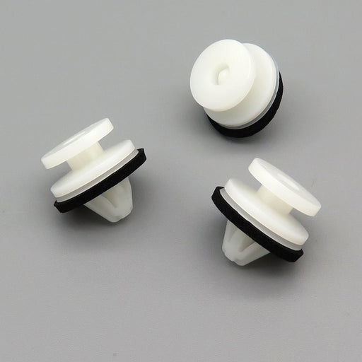 This two-piece clip includes a rubber sealing grommet that fits into a hole in the bodywork. The white plastic clip is mounted onto the trim and th...