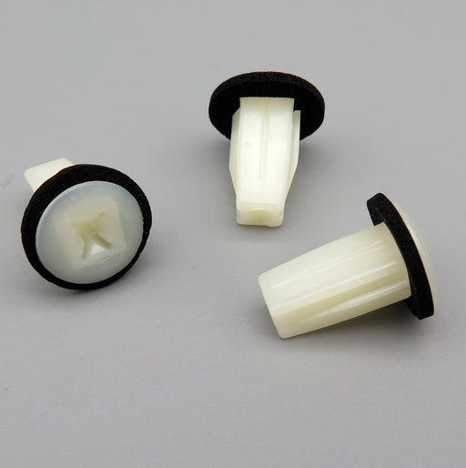 These plastic clips are used to attach rubber weatherstrip seals around apertures on the vehicle. The large head of the clip fits into a hole in th...