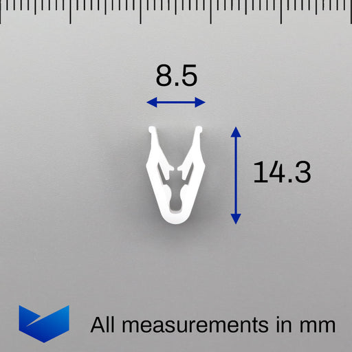 These white trim clips slide onto exterior trim mouldings and are used to secure them onto the bodywork.