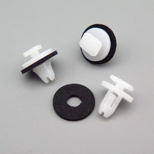 Small white plastic trim clips that are each pre-fitted with a removable foam washer. These type of clips are normally used for securing small trim...
