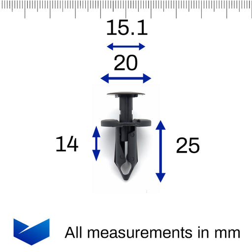 This clip fits into an 8mm hole and is used to secure parts such as undertrays, bumpers and wheel arch linings.