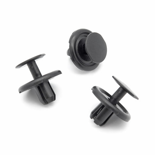 These distinctive trim clips are used on bumpers, shields and undertrays. They fit into a 9mm hole and have a wide 33mm collar.